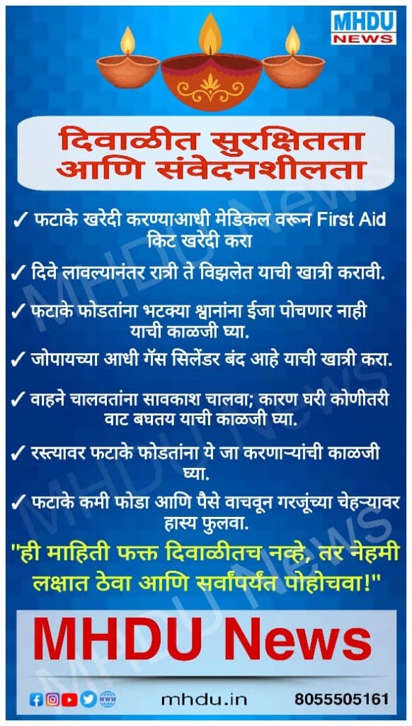 Diwali Safety and Sensitivity Tips | दिवाळीत सुरक्षितता आणि संवेदनशीलतादिवाळीत सुरक्षितता आणि संवेदनशीलतेची काळजी घेऊया — कारण उजेड फक्त दिव्यांचा नव्हे, तर आपल्या विचारांचाही असावा.